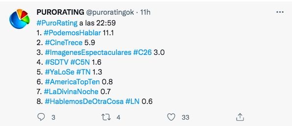 El ciclo arrancó arriba en las mediciones con 8.6 puntos de rating contra 6.6 de la película de El Trece, su principal competidor. Llegando a las 23:00, comenzó a ampliar diferencias, midiendo 11.1 puntos contra 5.9, números que se fueron ampliando hacia el final del programa.