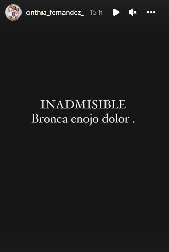Cinthia Fernández se mostró furiosa en las redes sociales en la noche del lunes. "Inadmisible. Bronca, enojo, dolor", expresó la panelista en sus redes sociales mientras que su hija menor, Francesca, permanece internada en un hospital de Punta Cana por una gastritis aguda.