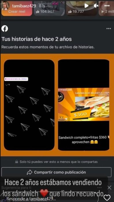 "Hace dos años estábamos vendiendo los sándwiches. Qué lindo recuerdo", expresó en sus historias la influencer. La pareja del artista contó que vendían milanesas y papas fritas para subsistir.