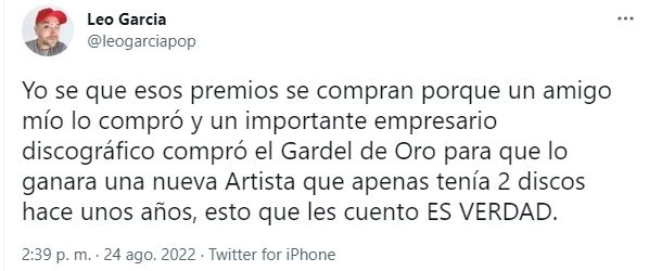 Finalmente, García hizo una fuerte denuncia contra los premios. "Yo se que esos premios se compran porque un amigo mío lo compró. Un importante empresario discográfico compró el Gardel de Oro para que lo ganara una nueva artista que apenas tenía 2 discos hace unos años, esto que les cuento es verdad", denunció en relación al galardón de oro recibido por Marilina Bertoldi en la edición 2018 realizada en Mendoza.