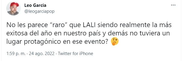 "¿No les parece ‘raro’ que Lali (Espósito), siendo realmente la más exitosa del año en nuestro país y además, no tuviera un lugar protagónico en ese evento?", agregó.