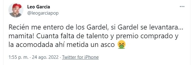 "Recién me entero de los Gardel, si Gardel se levantara… ¡mamita! Cuánta falta de talento y premio comprado y la acomodada ahí metida, un asco", escribió el cantante en su cuenta de Twitter.