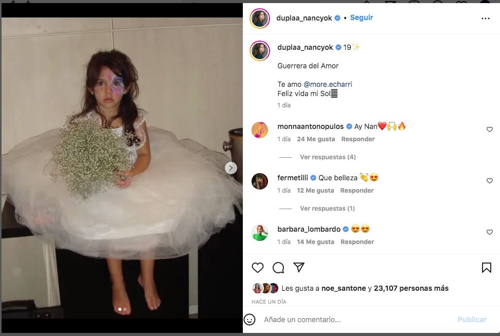“19. Guerrera del Amor. Te amo, More Echarri. Feliz vida, mi Sol”, fue la leyenda que acompañó a la foto en la que Dupláa mostró una foto de su hija cuando era pequeña y otra actual en la que se la ve muy distinta.