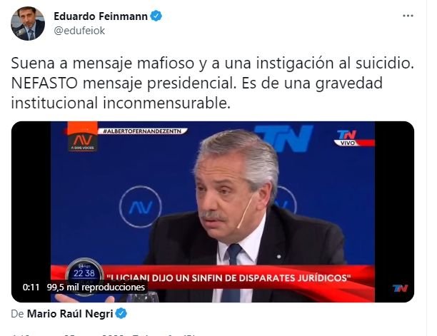 El que se sumó a las críticas fue Eduardo Feinmann. Desde su cuenta de Twitter, el periodista disparó de forma categórica contra Alberto, tildando de "mensaje mafioso" a sus dichos y considerando de "una gravedad institucional inconmensurable" lo ocurrido.