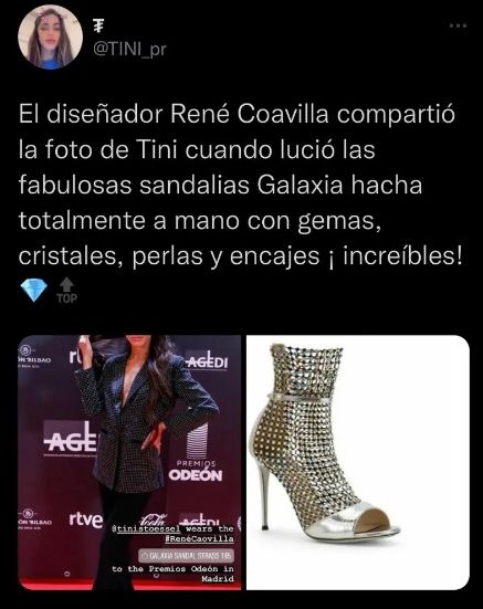 Sin embargo, el calzado de Tini está lejos de ser de segunda marca. Por el contrario. El diseñador René Coavilla fue quien le diseñó las sandalias a medida "hechas totalmente a mano con gemas, cristales, perlas y encajes", según indicó una fanática en las redes.
