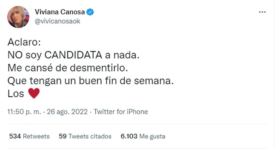 “Aclaro: No soy candidata a nada. Me cansé de desmentirlo. Que tengan un buen fin de semana. Los amo”, escribió Canosa desde su cuenta de Twitter. Este comentario se suma a otras breves publicaciones que viene haciendo la comunicadora desde la red.