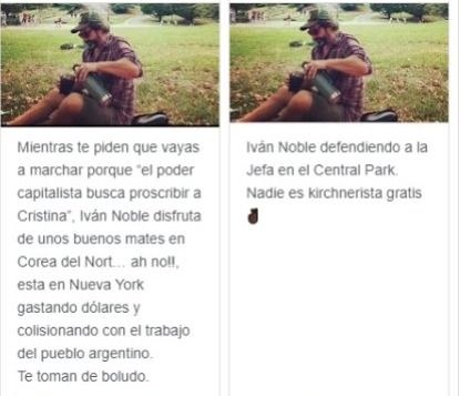 Alguno de los comentarios dicen: “Iván noble defendiendo a la jefa en el Central Park. Nadie es kirchnerista gratis”, “Mientras te pide que vayas a marchar porque el poder capitalista busca proscribir a Cristina, Iván Noble disfruta unos buenos mates en Corea del Norte… Ah no, está en Nueva York gastando dólares y colisionando con el trabajo del pueblo argentino”.