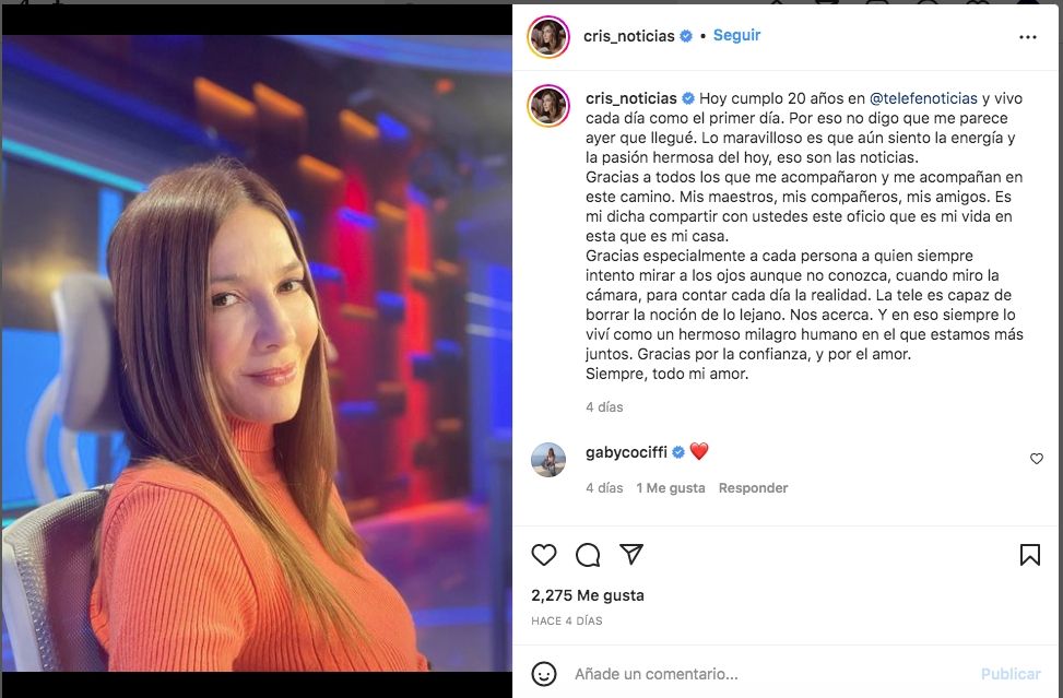 Con una foto de primer plano, en la que irradia alegría y un cúmulo de sensaciones, Cristina escribió: "Hoy cumplo 20 años en Telefe noticias y vivo cada día como el primer día. Por eso no digo que me parece ayer que llegué. Lo maravilloso es que aún siento la energía y la pasión hermosa del hoy, eso son las noticias".