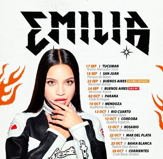 Emilia Mernes anunció hoy que visitará diez ciudades del interior del país en el marco de su primera gira nacional Tu Crees En Mí Tour. La artista urbana, que en septiembre dará dos funciones en el porteño Movistar Arena, viene dándose a conocer en todo el mundo con canciones que acumulan hasta hoy millones de reproducciones en las plataformas digitales, con éxitos como "Intoxicao" con Nicki Nicole, "Como si no importara" y "Esto recién empieza" con Duki y "Rápido lento" con Rusherking.