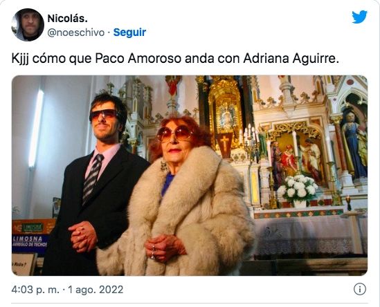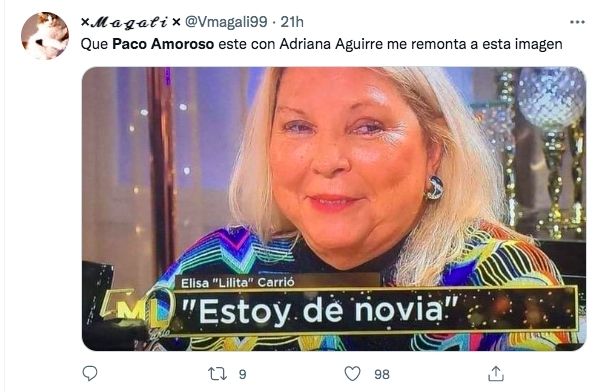 Acto seguido, las redes sociales se manifestaron. "El hecho que Adriana Aguirre este saliendo con Paco Amoroso me parece de lo más bizarro y hermoso que nos puede dar este país cuando uno pensaba que el buen entretenimiento había muerto con Showmatch"; "Paco Amoroso está saliendo con Adriana Aguirre? Si es verdad se gana el premio al más capo, es la milf que todo varón quiere tener, además de ser una diosa total", fueron algunos de los comentarios que circularon en Twitter reaccionando a la noticia del curioso romance.