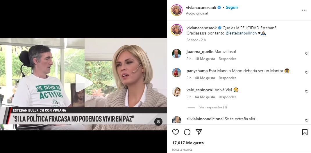 Tras conocer la noticia, Viviana Canosa se volcó a sus redes sociales donde compartió un emotivo posteo. La periodista y conductora publicó un fragmento de una entrevista que le hizo a Bullrich, donde hablaba sobre la felicidad.