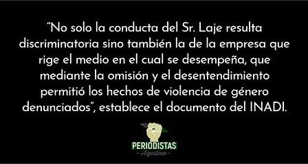 El Instituto Nacional contra la Discriminación, la Xenofobia y el Racismo (INADI) dio a conocer su opinión sobre las denuncias por maltrato contra Antonio Laje. Fueron varias periodistas quienes decidieron hacer público el destrato que recibieron de parte del conductor.
