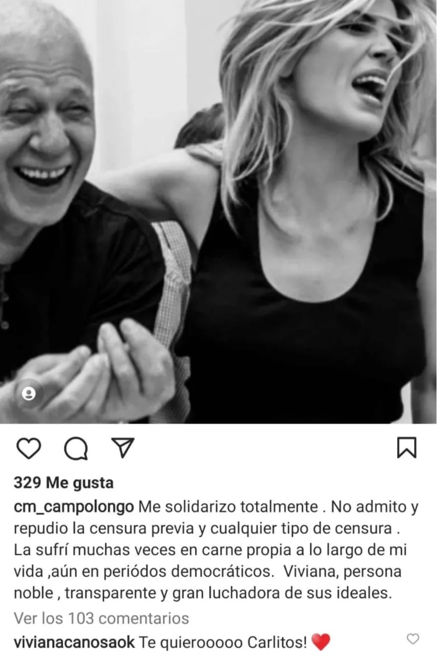 “Me solidarizo totalmente. No admito y repudio la censura previa, ni cualquier tipo de censura. La sufrí muchas veces en carne propia a lo largo de mi vida, aún en periodos democráticos. Viviana. Persona noble, transparente y gran luchadora de sus ideales”, escribió Campolongo en las redes con una foto junto a Canosa, quien respondió al posteo: “Te quiero Carlitos”.