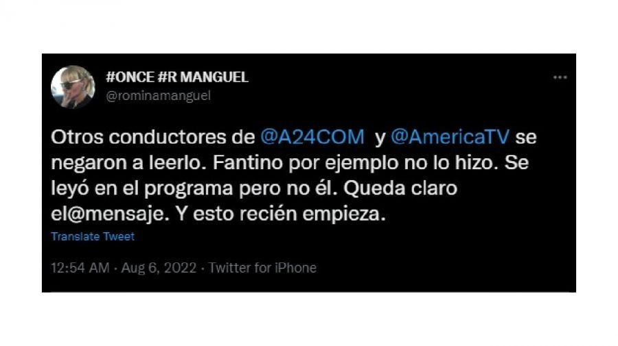 “Otros conductores de @A24COM y @AmericaTV se negaron a leerlo (el comunicado). Fantino, por ejemplo, no lo hizo. Se leyó en el programa pero no él. Queda claro el mensaje. Y esto recién empieza”, expresó a través de un mensaje en su cuenta de Twitter Romina Manguel.