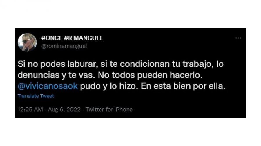 Luego, la periodista apoyó la decición de Viviana Canosa de renunciar a A24. “Si no podes laburar, si te condicionan tu trabajo, lo denuncias y te vas. No todos pueden hacerlo. @vivicanosaok pudo y lo hizo. En esta bien por ella”, escribió Manguel.