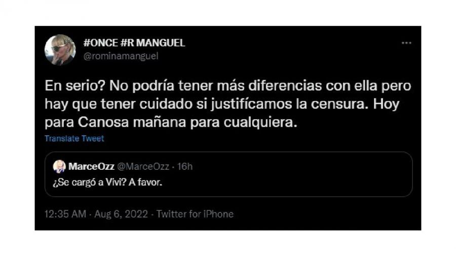 Finalmente, en otro mensaje Romina Manguel reflexionó sobre sus diferencias con Viviana Canosa, pero advirtió sobre la censura en los medios al sentenciar: "No podría tener más diferencias con ella, pero hay que tener cuidado si justificamos la censura. Hoy para Canosa, mañana para cualquiera”.
