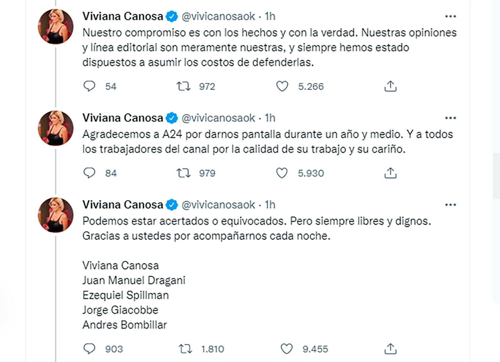 Desde su cuenta de Twitter, Canosa había anticipado: “Esta noche editorial Runflación”. Sin embargo, horas más tarde la periodista anunció su baja de A24 con un contundente mensaje. “Esta noche ha terminado nuestro ciclo #Vivianaconvos por A24. Hemos tenido diferencias con el canal en cuanto a la noción de libertad de expresión. Creemos que defender la libertad es también defender una institución básica”, escribió.