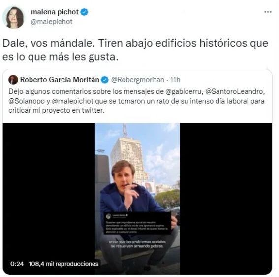 "Sos una basura", expresó en un primer posteo. Luego, agregó: "Dale, vos mandale. Tiren abajo edificios históricos que es lo que más les gusta".