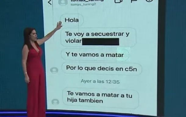 El crudo mensaje que recibió la periodista denota la gravedad del mismo, no sólo por lo dicho sino también por lo explícito y la misma frialdad del enunciado. "Hola. Te voy a secuestrar, violar y te vamos a matar, por lo que decís en C5N", dijo el implicado a través de una cuenta anónima en Instagram.