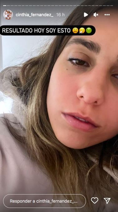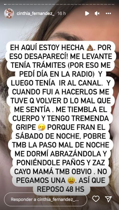 "He aquí hecha (sumando un emoji de materia fecal). Por eso desaparecí. Me levanté y tenía trámites, por eso me pedí el día en la radio, y luego tenía que ir al canal. Y cuando fui a hacerlos me tuve que volver de lo mal que me sentía. Me tiembla el cuerpo y tengo tremenda gripe porque Fran el sábado de noche, pobre también la pasó mal. Me dormí abrazándola y poniéndole paños y zaz, cayó mamá también, obvio. No pegamos una. Así que reposo 48 horas", explicó Cinthia en varias historias de su cuenta de Instagram.
