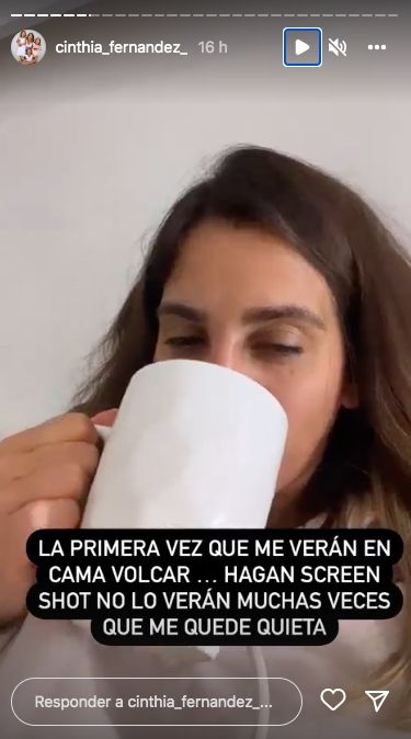 Luego, agregó otra imagen de ella, con cara de cansada: "El resultado de hoy, es esto·. Y con otra imagen en la que se la ve tomando un té, agregó: "La primera vez que me verán en cama volcar. Hagan screen shot no verán muchas veces que me quede quieta".