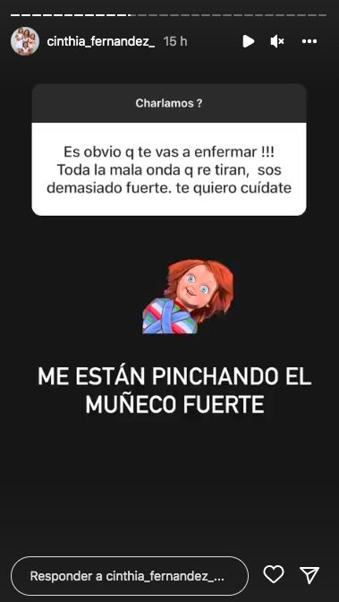 Además, decidió responder preguntas de sus seguidores, y sorprendió al revelar por qué piensa que estaba enferma. "Es obvio que te vas a enfermar, toda la mala onda que te tiran, sos demasiado fuerte, te quiero, cuidate", escribió un usuario y ella respondió: "Me están pinchando el muñeco fuerte".