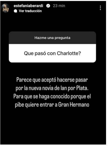 En cuanto a los motivos de esta puesta en escena, de esta maniobra de Charlotte e Ian, Berardi agregó con total seguridad que: “Lo hizo para que se haga conocido porque el pibe quiere entrar a Gran Hermano". Una posibilidad que todavía no tuvo una desmentida.