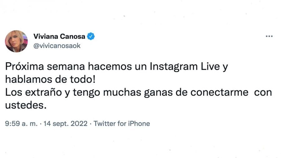 Mientras evalúa propuestas y estrategias para su vuelta a los medios, Viviana Canosa escribió desde su cuenta de Twitter: "¡Próxima semana hacemos un Instagram Live y hablamos de todo! Los extraño y tengo muchas ganas de conectarme con ustedes", expresó la periodista que recientemente hizo una exitosa transmisión en vivo desde sus redes que fue seguida por más de 30.000 personas.