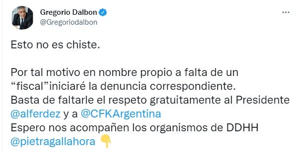 "Esto no es chiste. Por tal motivo en nombre propio a falta de un ‘fiscal’ iniciaré la denuncia correspondiente", apuntó el abogado de Cristina. "Basta de faltarle el respeto gratuitamente al presidente Alberto Fernández y a Cristina Kirchner. Espero nos acompañen los organismos de DDHH", agregó.