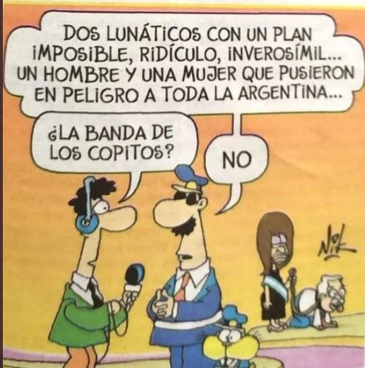 En la viñeta se puede observar una conversación entre un periodista y un policía. "Dos lunáticos con un plan imposible, ridículo, inverosímil... un hombre y una mujer que pusieron en peligro a toda la argentina", comenta el uniformado. Entonces, el periodista le consulta: "¿La Banda de los Copitos?", a lo que el policía responde: "No" y en el fondo se puede ver una caricatura de Alberto Fernández como si fuera una mascota de Cristina.
