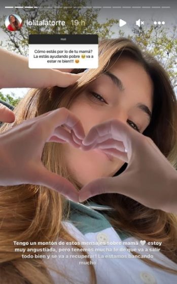 En este contexto de preocupación familiar, en las últimas horas Lola Latorre utilizó sus redes sociales para hablar de la salud de su mamá. Tras las repercusiones de la noticia, su hija respondió una serie de preguntas de sus seguidores. "¿Cómo estás por lo de tu mamá? ¿La estás ayudando? Pobre, va a estar re bien", le consultó un usuario.