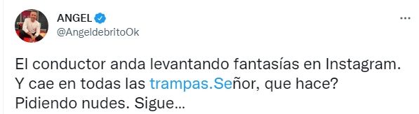 El periodista publicó algunas capturas de pantalla de una ardiente conversación de este famoso con una chica. "El conductor anda levantando fantasías en Instagram. Y cae en todas las trampas señor, ¿qué hace? Pidiendo nudes. Sigue…", escribió Ángel junto a las capturas de esta persona a la cual el periodista decidió no revelar su identidad.