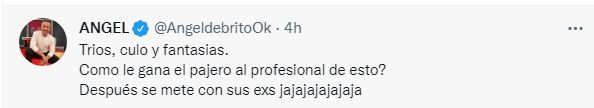 En otro tuit, de Brito específica: "Tríos, cul* y fantasías. ¿Cómo le gana el pajer* al profesional de esto? Después se mete con sus exs jajajajajajaja". En los chats se pueden leer mensajes como: "Si te animas te lo muestro en vivo", mientras que la mujer le responde: "Mostrame primero".