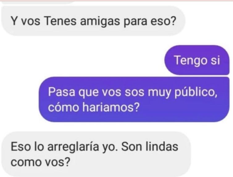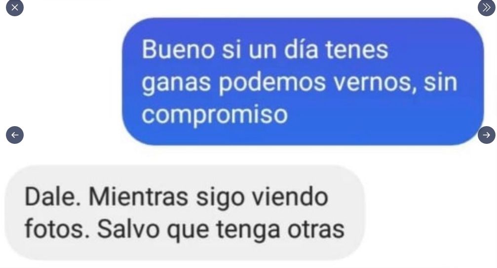 "Bueno, si un día tenés ganas, podemos verlo sin compromiso", expresa él, mientras la mujer prefiere mantenerse distante: "Dale. Mientras sigo viendo fotos. Salvo que tenga otras". Pero cuando se habla de una la posible encuentro sexual, el presentador en consulta: "¿Y vos tenés amigas para eso?". "Tengo, sí. Pasa que vos sos muy público, ¿cómo haríamos?", contesta ella. "Eso lo arreglaría yo. ¿Son lindas como vos?", asegura el conductor.