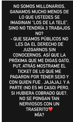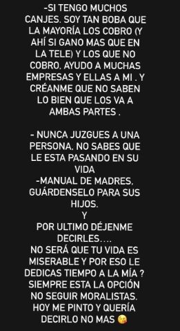 Lo más llamativo llegó después con unos textos que redactó y subió a sus stories, con los que trató de desmitificar que su cotidianidad se configure en un campo de rosas y sobre todo que sus ingresos la convierten en millonaria, en una persona acaudalada.