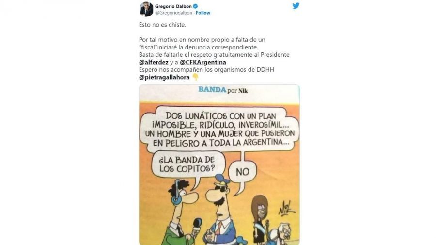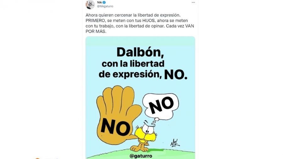Frente a la reacción del letrado de la vicepresidenta, Nik expresó desde Twitter: "Dalbón, el abogado de Cristina Kirchner, me quiere preso, o callado, o amordazado con la advertencia: Te equivocaste feo, te va a salir muy caro. Con la libertad de expresión, NO".