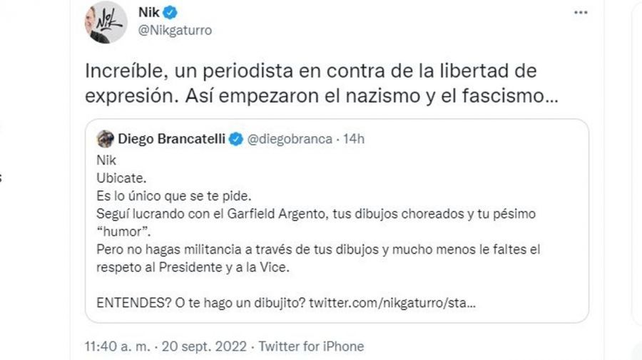 Por su parte, Diego Brancatelli no se quedó callado y arremetió: “Nik. Ubicate. Es lo único que se te pide. Seguí lucrando con el Garfield Argento, tus dibujos choreados y tu pésimo ‘humor’. Pero no hagas militancia a través de tus dibujos y mucho menos le faltes el respeto al Presidente y a la Vice. ENTENDES? O te hago un dibujito?”.