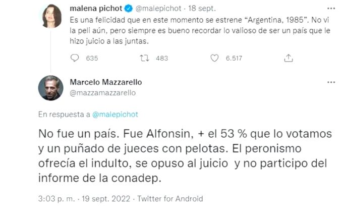 Antes de su estreno oficial, la película ya causó gran repercusión. En este sentido, Malena Pichot protagonizó un fuerte cruce con Marcelo Mazzarello. La humorista compartió su opinión sobre lo que para ella representa el estreno de una película de esta temática en el contexto actual que vivimos. "Es una felicidad que en este momento se estrene Argentina, 1985. No vi la película aún, pero siempre es bueno recordar lo valioso de ser un país que le hizo juicio a las juntas", escribió Pichot.