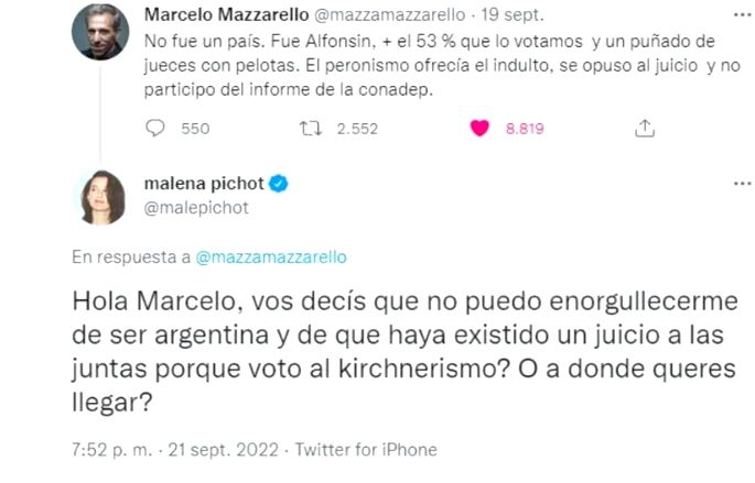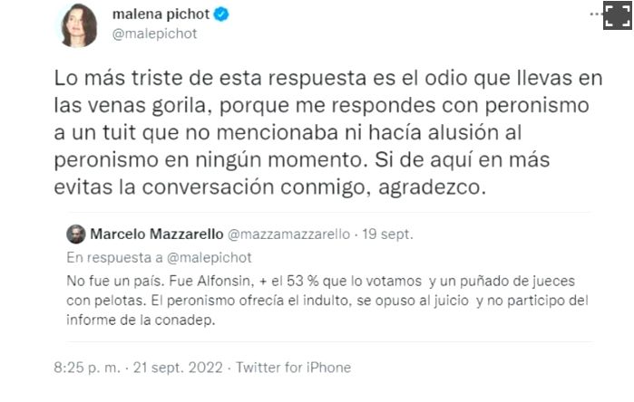 Como era de esperarse, Pichot le respondió al actor. "Hola Marcelo, ¿Vos decís que no puedo enorgullecerme de ser argentina y de que haya existido un Juicio a las Juntas porque voto al kirchnerismo? ¿O a dónde querés llegar?", disparó. Luego, agregó contundente: "Lo más triste de esta respuesta es el odio que llevás en las venas gorila (sic), porque me respondés con peronismo a un tuit que no mencionaba ni hacía alusión al peronismo en ningún momento. Si de aquí en más evitás la conversación conmigo, agradezco".