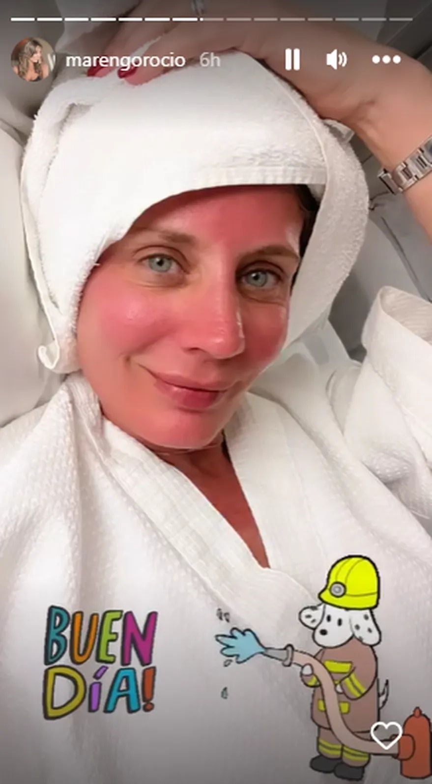 Con su rostro y el pecho notoriamente colorados y envuelta en una bata, Marengo comentó desde sus historias de Instagram: “¡Oh, oh! Alguien se quemó de más. Estaba nubladito y pensé que estaba todo bien, pero tuve problemas graves”. Acto seguido consultó: “¿Mami, esto es quemadura de primer grado?”.
