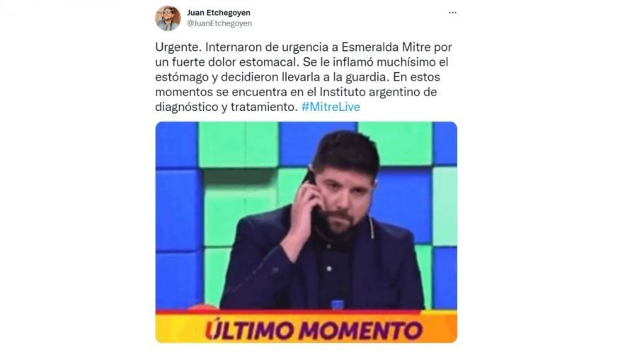 Sobre su internación, desde sus redes sociales el periodista Juan Etchegoyen detalló: "Internaron de urgencia a Esmeralda Mitre por un fuerte dolor estomacal. Se le inflamó muchísimo el estómago y decidieron llevarla a la guardia. En estos momentos se encuentra en el Instituto Argentino de Diagnóstico y Tratamiento".