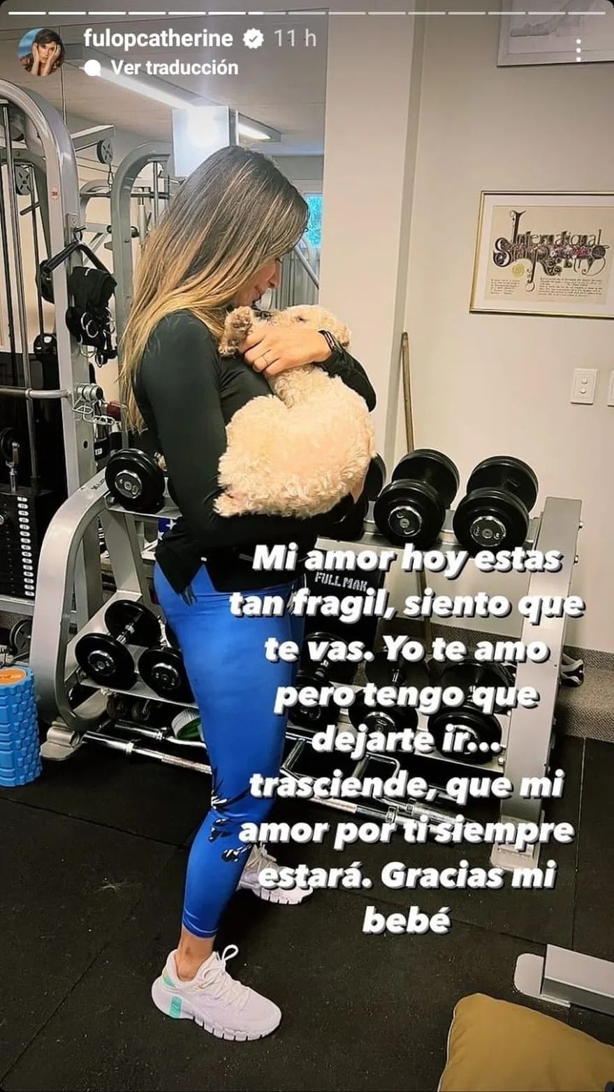 En una de las fotos, Catherine Fulop tiene en brazos al perro en el gimnasio de la casa y escribió: “Mi amor hoy estás tan frágil, siento que te vas. Yo te amo, pero tengo que dejarte ir... Trasciende que mi amor por ti siempre estará. Gracias mi bebé”.