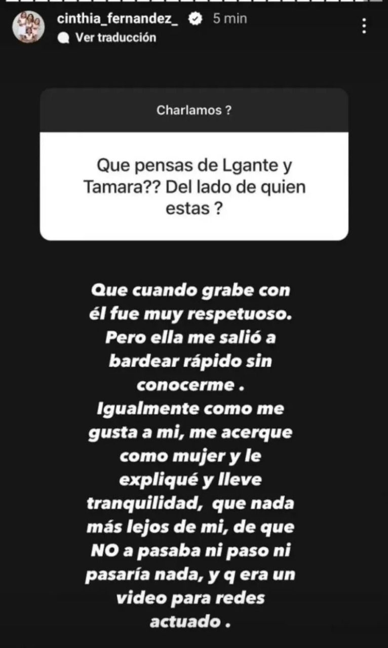 Todo se dio cuando un seguidor le consultó a Cinthia en las redes, qué opina sobre la separación de L-Gante y Tamara. Picante, la panelista de Momento D atacó a Báez: "Que cuando grabé con él, fue muy respetuoso, pero ella me salió a bardear rápido sin conocerme".