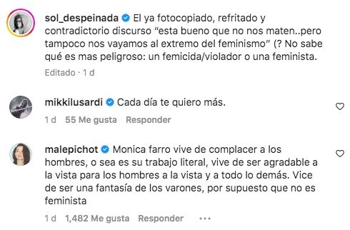 Tras enterarse del comentario, Pichot se volcó a sus redes sociales para compartir una dura opinión sobre Farro. "Mónica Farro vive de complacer a los hombres, o sea es su trabajo literal, vive de ser agradable a la vista para los hombres y a todo lo demás. Vive de ser una fantasía de los varones, por supuesto que no es feminista", disparó contundente la humorista.