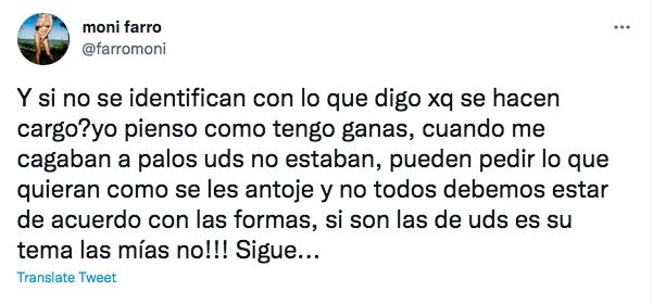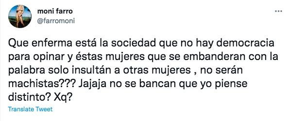 Como era de esperarse, Farro no se quedó de brazos cruzados y publicó un descargo en Twitter. "Qué enferma está la sociedad que no hay democracia para opinar y estas mujeres que, se embanderan con la palabra, solo insultan a otras mujeres, ¿no serán machistas? Jajaja ¿No se bancan que yo piense distinto? ¿Por qué?", expresó en un primer mensaje.