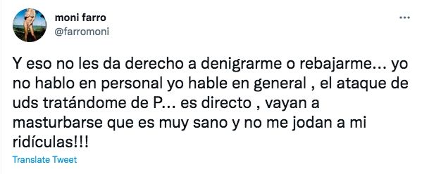 Finalmente, se refirió al comentario en el que Pichot afirmaba que Farro no era feminista porque "vive de complacer a los hombres": "Y eso no les da derecho a denigrarme o rebajarme... Yo no hablo en personal, yo hablé en general, el ataque de ustedes tratándome de p... es directo, vayan a masturbarse que es muy sano y no me jodan a mí ¡ridículas!".