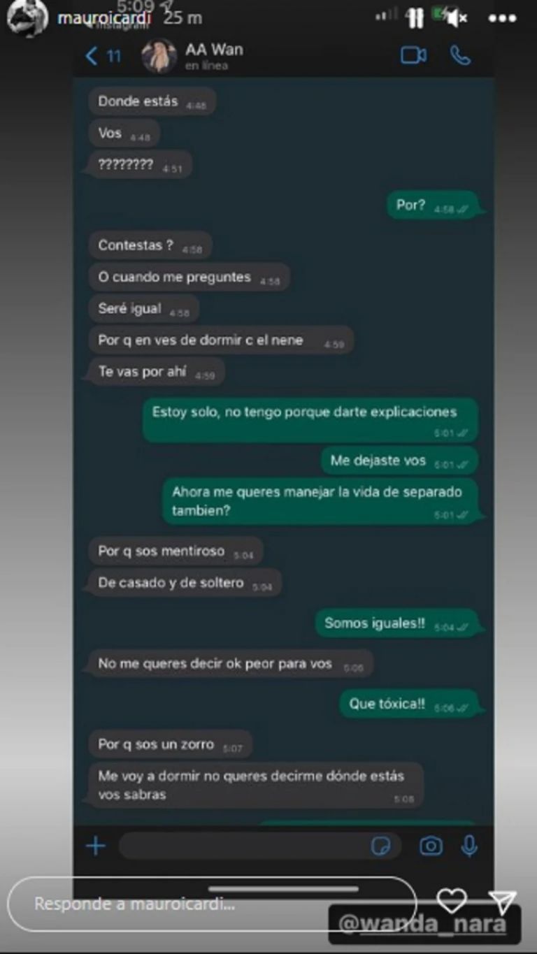 Fue entonces que Wanda Nara lanzo una fuerte acusación contra su marido en medio del escándalo: "Porque sos mentiroso, de casado y de soltero. ¿No me querés decir? Ok, peor para vos. Porque sos un zorro. Me voy a dormir, no querés decirme donde estás, vos sabrás".