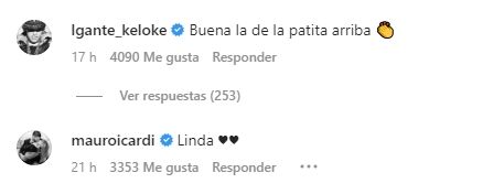 Ahora, en las últimas horas, la empresaria compartió una sensual foto en su Instagram que recibió comentarios tanto de L-Gante como de Mauro Icardi. "Ah bueno esa enmascarada", expresó el artista junto al emoji de un corazón y un fueguito. Y más tarde, agregó: "Buena la de la patita arriba". El futbolista no quiso quedarse detrás y expresó: "Linda".