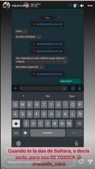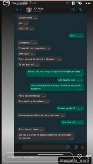 Entre los mensajes que se pueden ver figuran algunos amenazantes: "¿No me querés decir? Ok, peor para vos", le escribe ella. "¡Qué tóxica!", comentó Mauro, a lo que Wanda responde: "Porque sos un zorro. Me voy a dormir, no querés decirme donde estás, vos sabrás".