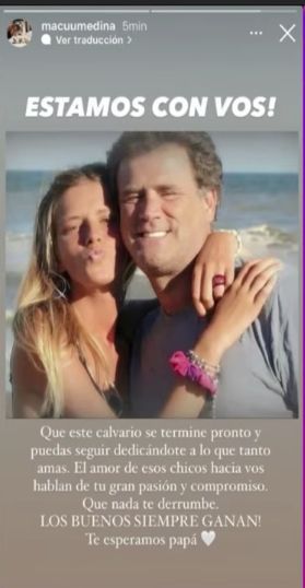 En una storie, la joven abrió su corazón para escribir unas líneas muy emotivas en apoyo al famoso. “Estamos con vos. Que este calvario se termine pronto y puedas seguir dedicándote a lo que tanto amas. El amor de esos chicos hacia vos habla de tu gran pasión y compromiso. Que nada te derrumbe. Los buenos siempre ganan. Te esperamos pa”, posteó.